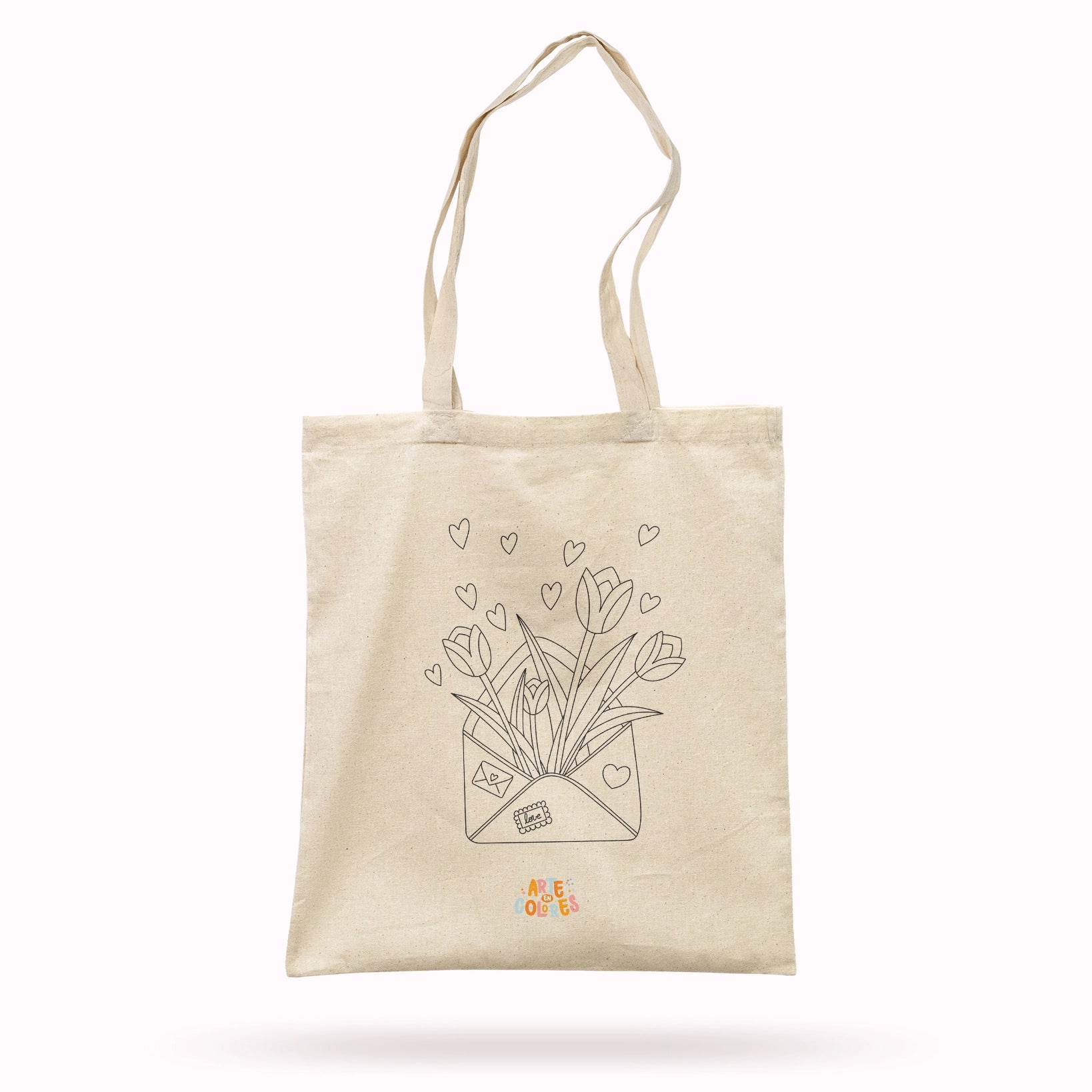¡Personaliza tu propia bolsa! Esta tote bag de algodón 100% (tela crea) incluye un diseño de sobre lineal impreso listo para ser pintado con los materiales que tú prefieras, preferiblemente acrílicos o pintura para tela.